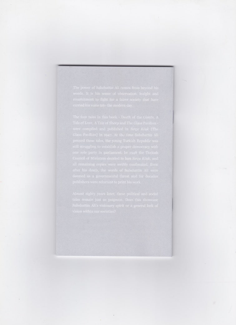 The four tales in this book - Death of the Giants, A Tale of Love, A Tale of Sheep and The Glass Pavilion - were compiled and published in Sırça Köşk [The Glass Pavilion] in 1947. At the time Sabahattin Ali penned these tales, the young Turkish Republic was still struggling to establish a proper democracy with one sole party in parliament. In 1948 the Turkish Council of Ministers decided to ban Sırça Köşk, and all remaining copies were swiftly confiscated. Even after his death, the words of Sabahattin Ali were deemed as a governmental threat and for decades publishers were reluctant to print his work.