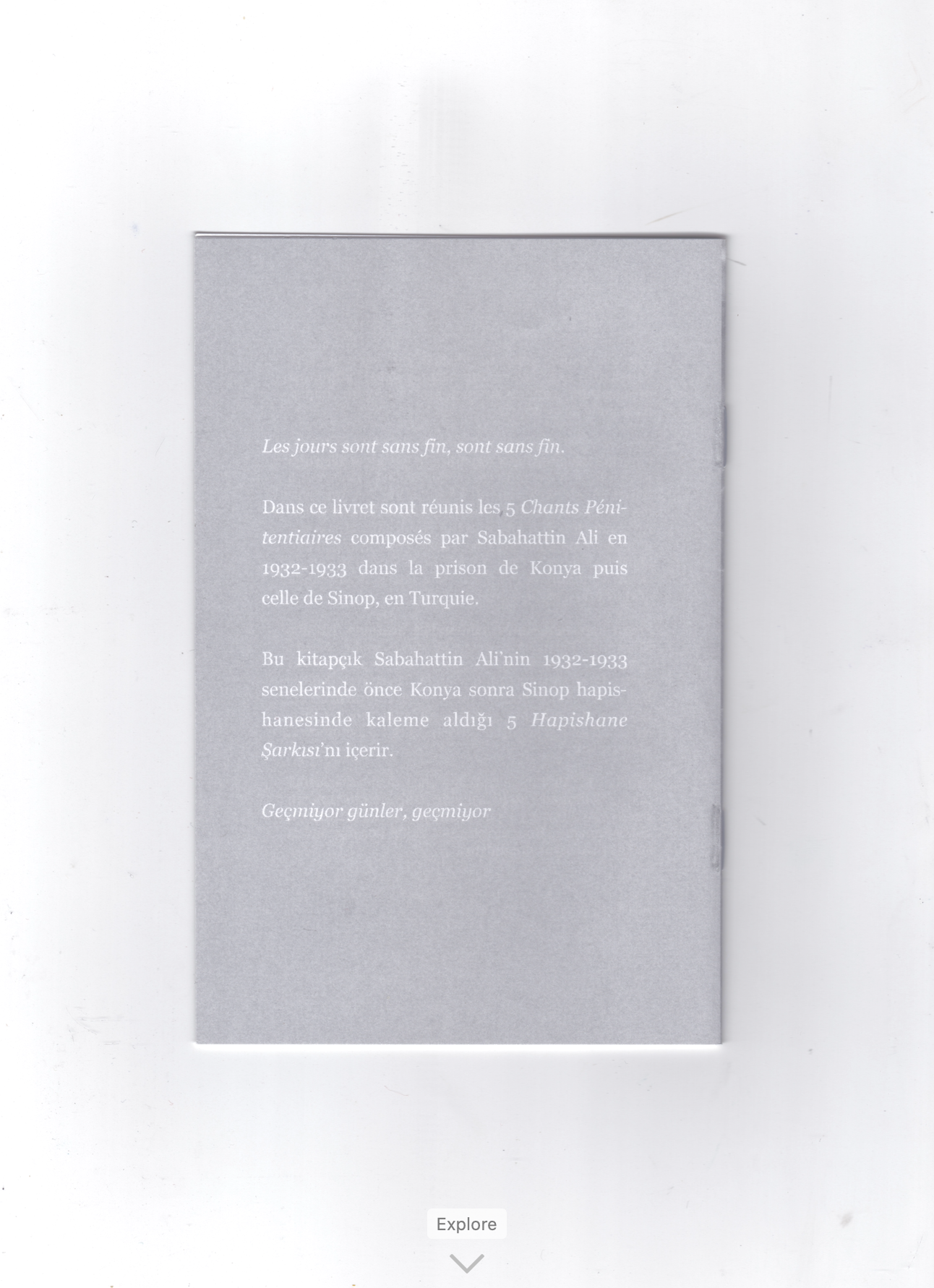 Dans ce livret sont réunis les 5 Chants Pénitentiaires composés par Sabahattin Ali en 1932-1933 dans la prison de Konya puis celle de Sinop, en Turquie.