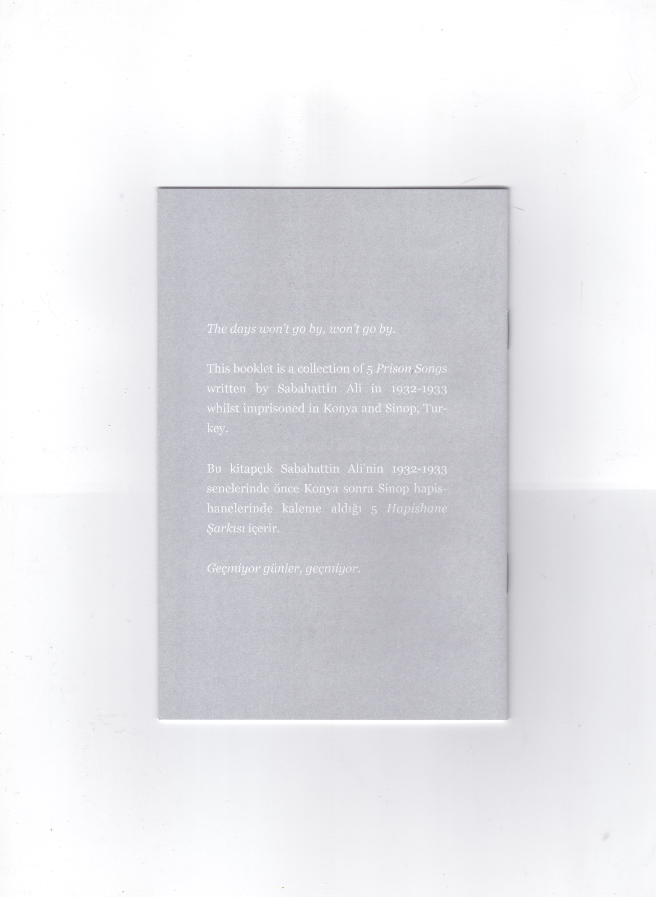 This booklet is a collection of 5 Prison Songs written by Sabahattin Ali in 1932-1933 whilst imprisoned in Konya and Sinop, Turkey.